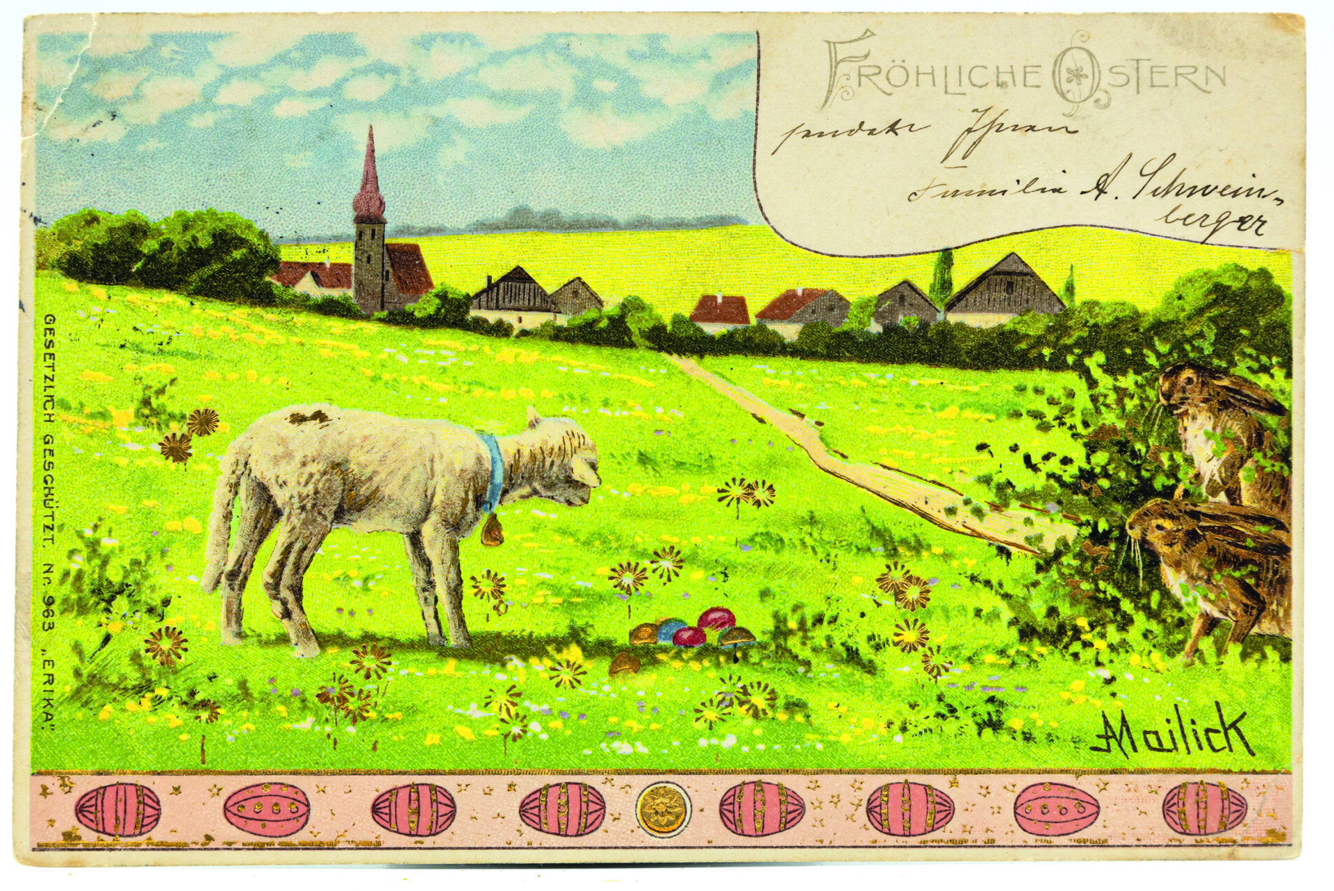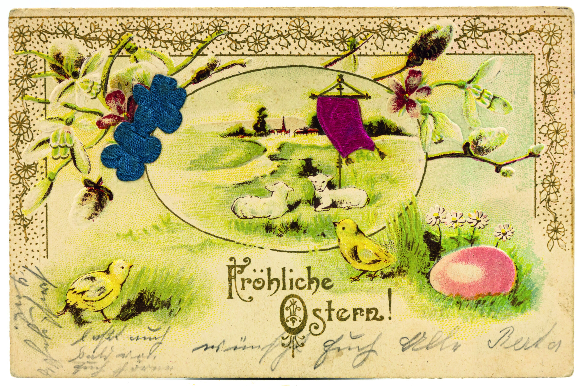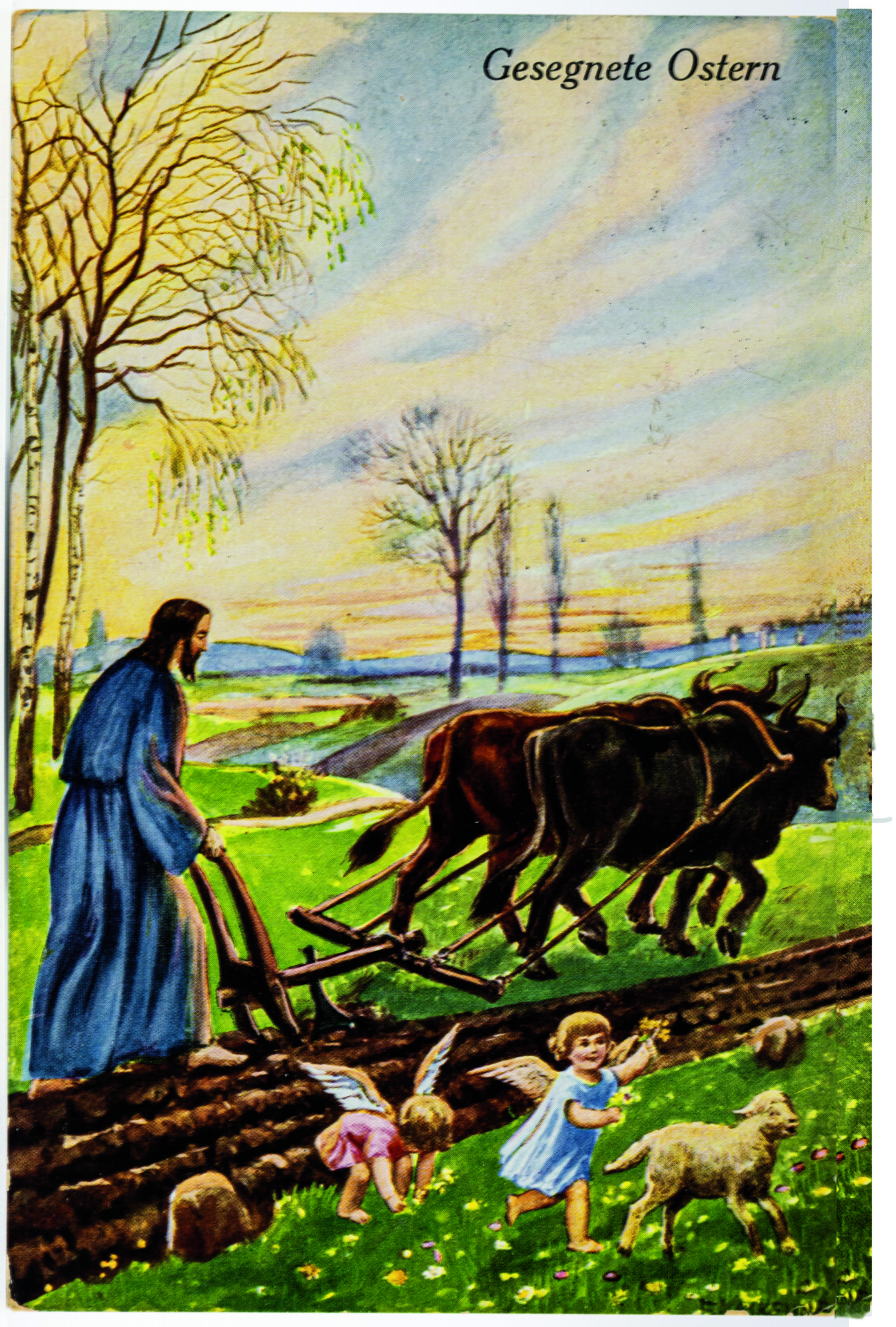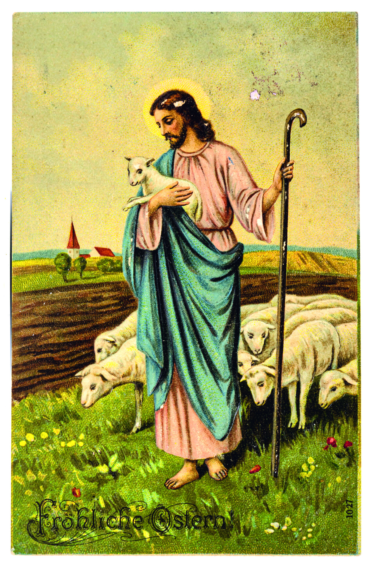 Schafherden oder Lämmer waren auf Bildpostkarten ein beliebtes Motiv, häufig eingebettet in Frühlingslandschaften. Deren wichtige Elemente sind auf Karte 1 zu sehen: ein Fußpfad, häufig entlang eines Bachlaufs, und eine blühende Wiese, in der Hasen hoppeln und ein Lämmchen steht. Bevorzugte Bäume sind Birken mit dekorativen schwarz-weiß-gefleckten Stämmen, Weiden oder weiß bzw. rosa blühende Obstgehölze. Im Bildhintergrund deuten ein Kirchturm und Hausdächer ein Dorf an, niedrige Hügelzüge runden das Idyll ab. Das Lamm spielt als Christussymbol eine wichtige Rolle. Auf Karte 2 ist es mit einer Siegesfahne als Zeichen der Auferstehungshoffnung ausgestattet. Auf das weltliche Osterfest verweisend, sind ihm ein zweites Lamm, ein Küken, ein Osterei und Blüten beigegeben. Karte 3 ist ein Klassiker der populären Druckgraphik: Jesus erscheint als der in der Bibel häufig zitierte gute Hirte (z. B. Johannes-Evangelium 10, 11-21), im rechten Arm ein Lamm haltend, in der linken Hand den Hirtenstab. Das Bild des guten Hirten ist seit der Reformation beliebt und in der zweiten Hälfte des 19. Jahrhunderts als massenhaft hergestellter Öldruck nachgewiesen. Variationen bilden Christus vor oder mit einer Schafherde ab, mit einem Lamm über den Schultern oder