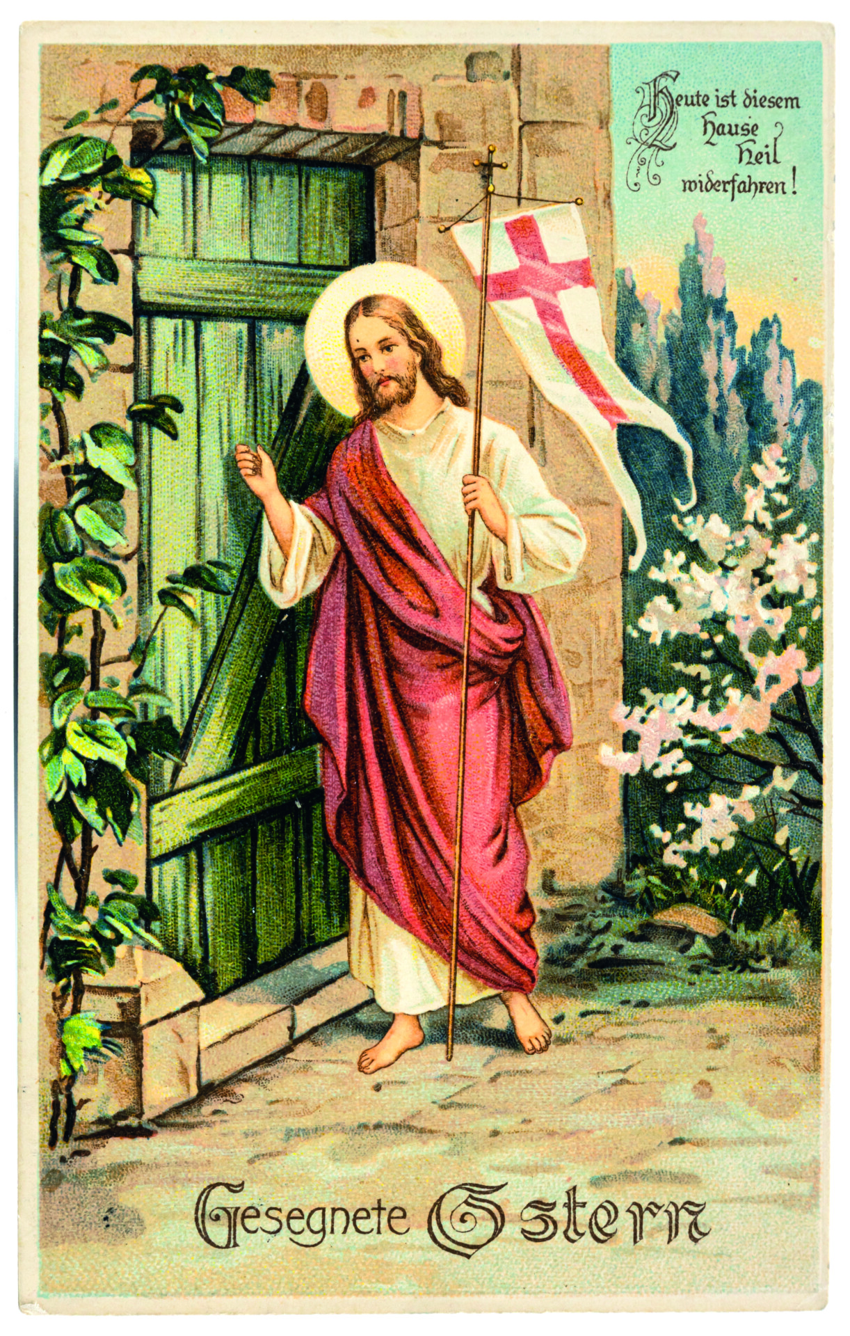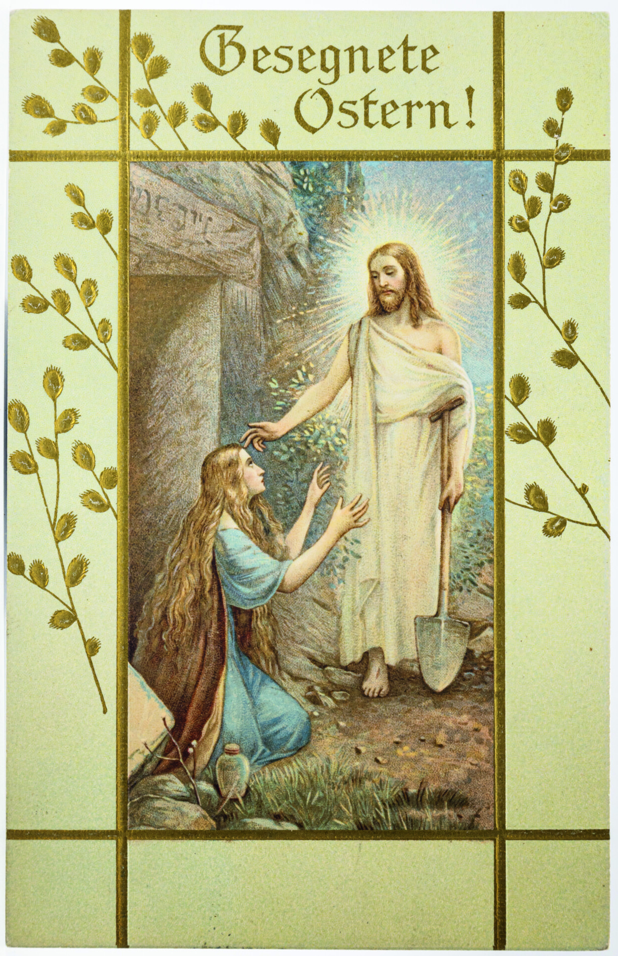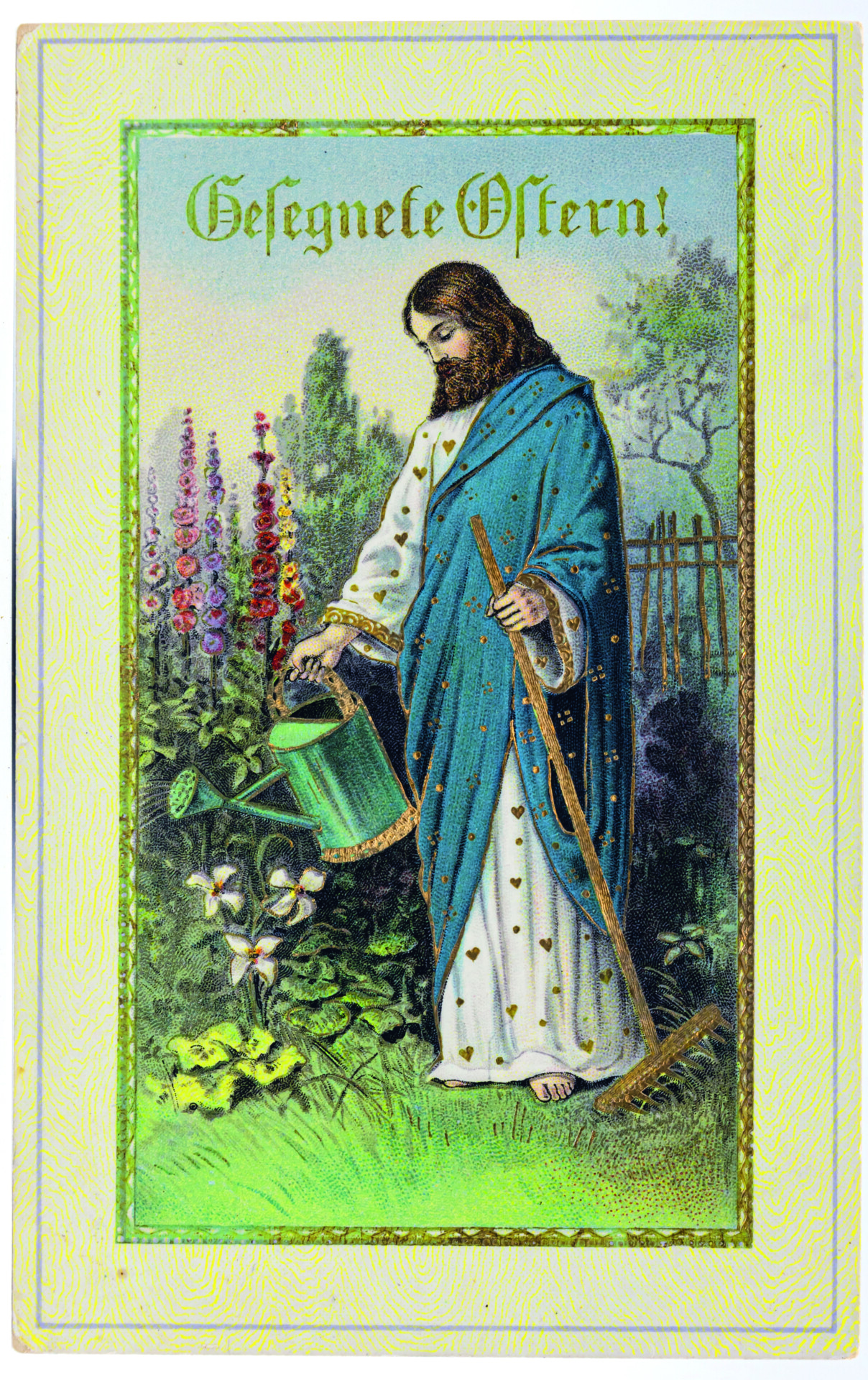 Die Auferstehung Jesu ist der Urgrund des Glaubens in den christlichen Kirchen. Auf das Johannes-Evangelium (20, 15-17) beziehen sich zwei Karten. Karte 6 veranschaulicht den Moment, in dem Maria Magdalena den auferstandenen Jesus vor seinem Grab zunächst für einen Gärtner hält. Sie ist erkennbar an ihrem langen, offenen Haar und dem Salbgefäß, das neben ihr steht. Die Hände betend erhoben, kniet sie vor Jesus. Er streckt den rechten Arm in einer – schlecht getroffenen – abwehrenden Geste zu ihr hin: Magdalena soll ihn nicht berühren. Die Schaufel in der linken Hand weist auf die Verwechslung Jesu mit dem Gärtner hin. Karte 7 zeigt eine biedermeierlich anmutende Version, in der Jesus mit einer Gießkanne und einem Rechen ausgerüstet ist und in einem ländlichen Garten mit Staketenzaun üppig blühende Malven gießt. Sein Untergewand ist verschwenderisch mit goldfarbenen Herzchen geschmückt. Hier mischen sich biblische Erzählung, Reminiszenzen an die Gartenarbeit in der Frühlingszeit und Lust am Kitsch. Auferstehungsmotive nehmen Bezug auf das Matthäus-Evangelium (28, 2-4): „Plötzlich entstand ein gewaltiges Erdbeben: denn ein Engel des Herrn kam vom Himmel herab, trat an das Grab, wälzte den Stein weg und setzte sich darauf. […] Die Wächter begannen vor Angst zu zittern und fielen wie tot zu Boden.“ Diese Wächter sind auf Karte 8 als römische Soldaten dargestellt. Auf den Karten 9 und 10 ist der Auferstandene in traditioneller Siegespose dargestellt, aufwändig mit Glimmer bzw. Moosen und Atlasschleife ausstaffiert. Die bildliche Darstellung der ebenso dramatischen wie hoffnungsspendenden Ereignisse rund um die Auferstehung wurde bis in die 1930er Jahre in zahlreichen Variationen vertrieben.