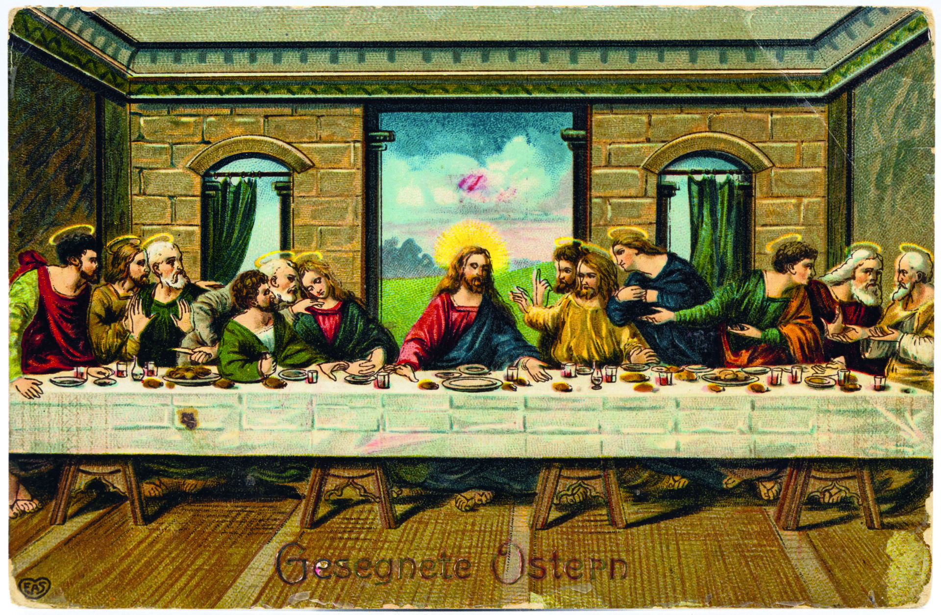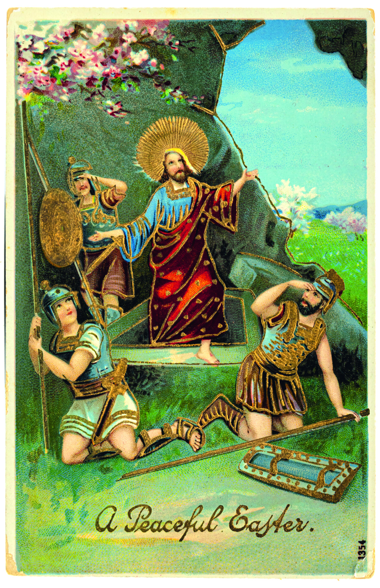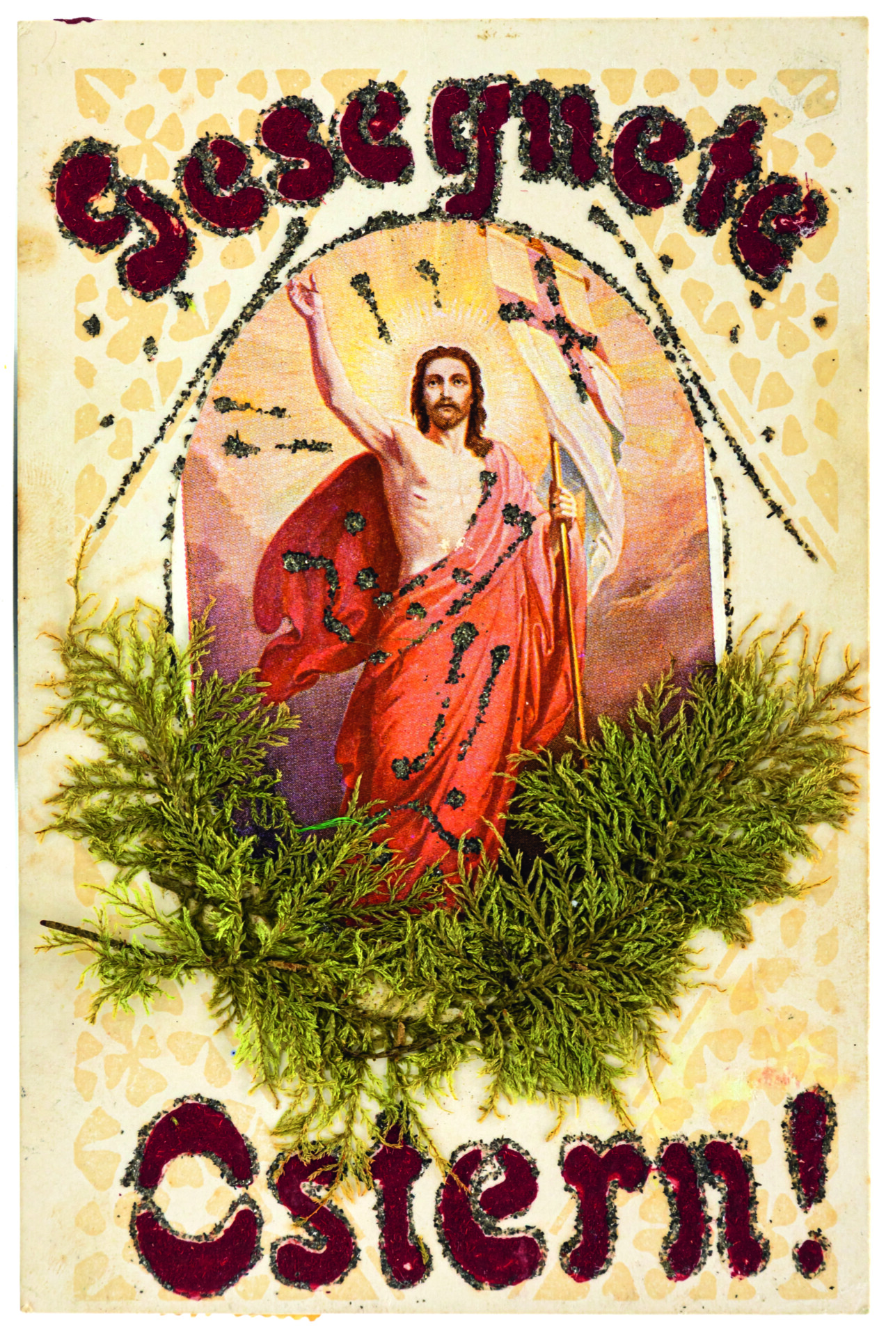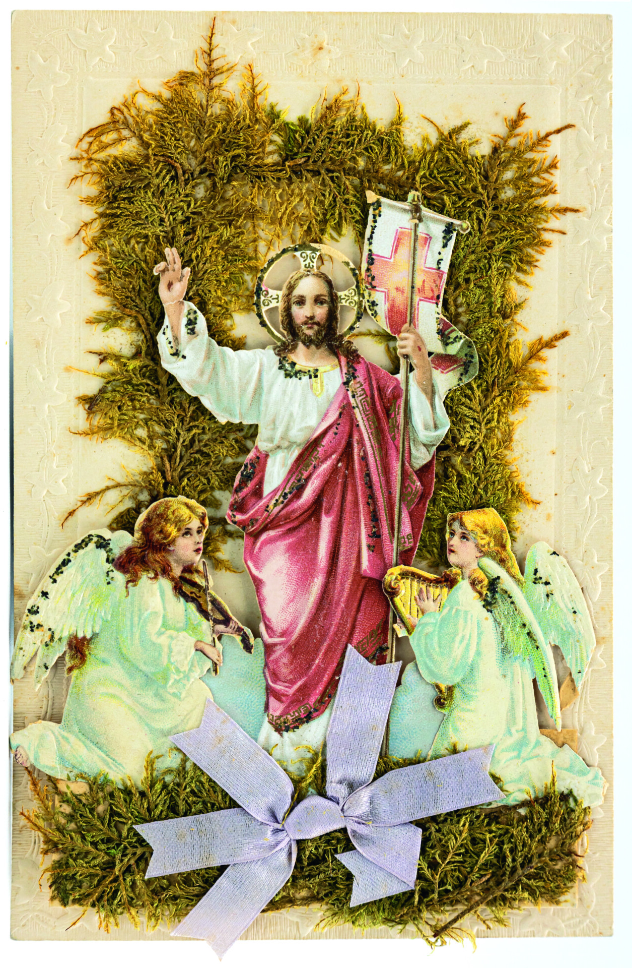 Die Auferstehung Jesu ist der Urgrund des Glaubens in den christlichen Kirchen. Auf das Johannes-Evangelium (20, 15-17) beziehen sich zwei Karten. Karte 6 veranschaulicht den Moment, in dem Maria Magdalena den auferstandenen Jesus vor seinem Grab zunächst für einen Gärtner hält. Sie ist erkennbar an ihrem langen, offenen Haar und dem Salbgefäß, das neben ihr steht. Die Hände betend erhoben, kniet sie vor Jesus. Er streckt den rechten Arm in einer – schlecht getroffenen – abwehrenden Geste zu ihr hin: Magdalena soll ihn nicht berühren. Die Schaufel in der linken Hand weist auf die Verwechslung Jesu mit dem Gärtner hin. Karte 7 zeigt eine biedermeierlich anmutende Version, in der Jesus mit einer Gießkanne und einem Rechen ausgerüstet ist und in einem ländlichen Garten mit Staketenzaun üppig blühende Malven gießt. Sein Untergewand ist verschwenderisch mit goldfarbenen Herzchen geschmückt. Hier mischen sich biblische Erzählung, Reminiszenzen an die Gartenarbeit in der Frühlingszeit und Lust am Kitsch. Auferstehungsmotive nehmen Bezug auf das Matthäus-Evangelium (28, 2-4): „Plötzlich entstand ein gewaltiges Erdbeben: denn ein Engel des Herrn kam vom Himmel herab, trat an das Grab, wälzte den Stein weg und setzte sich darauf. […] Die Wächter begannen vor Angst zu zittern und fielen wie tot zu Boden.“ Diese Wächter sind auf Karte 8 als römische Soldaten dargestellt. Auf den Karten 9 und 10 ist der Auferstandene in traditioneller Siegespose dargestellt, aufwändig mit Glimmer bzw. Moosen und Atlasschleife ausstaffiert. Die bildliche Darstellung der ebenso dramatischen wie hoffnungsspendenden Ereignisse rund um die Auferstehung wurde bis in die 1930er Jahre in zahlreichen Variationen vertrieben.
