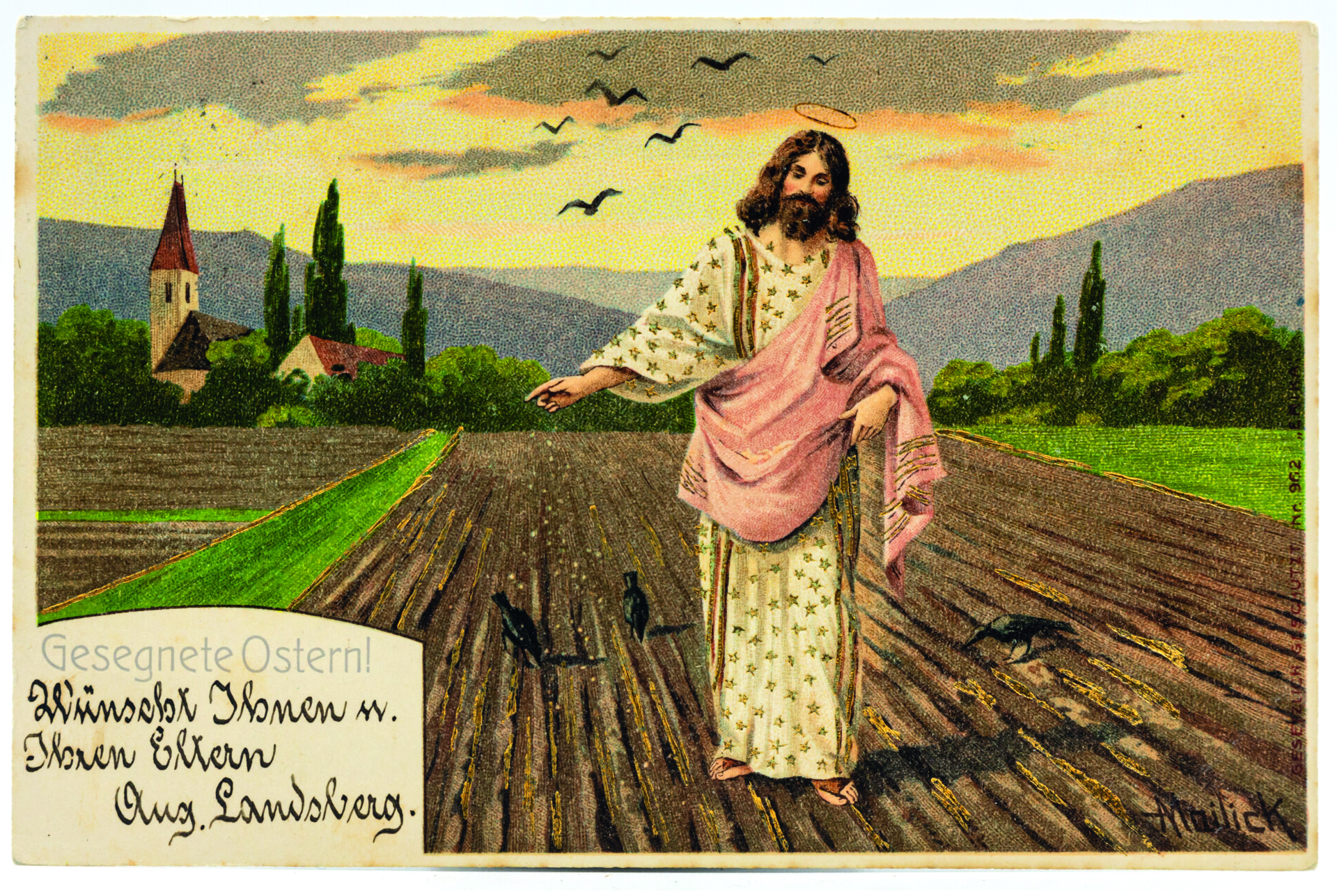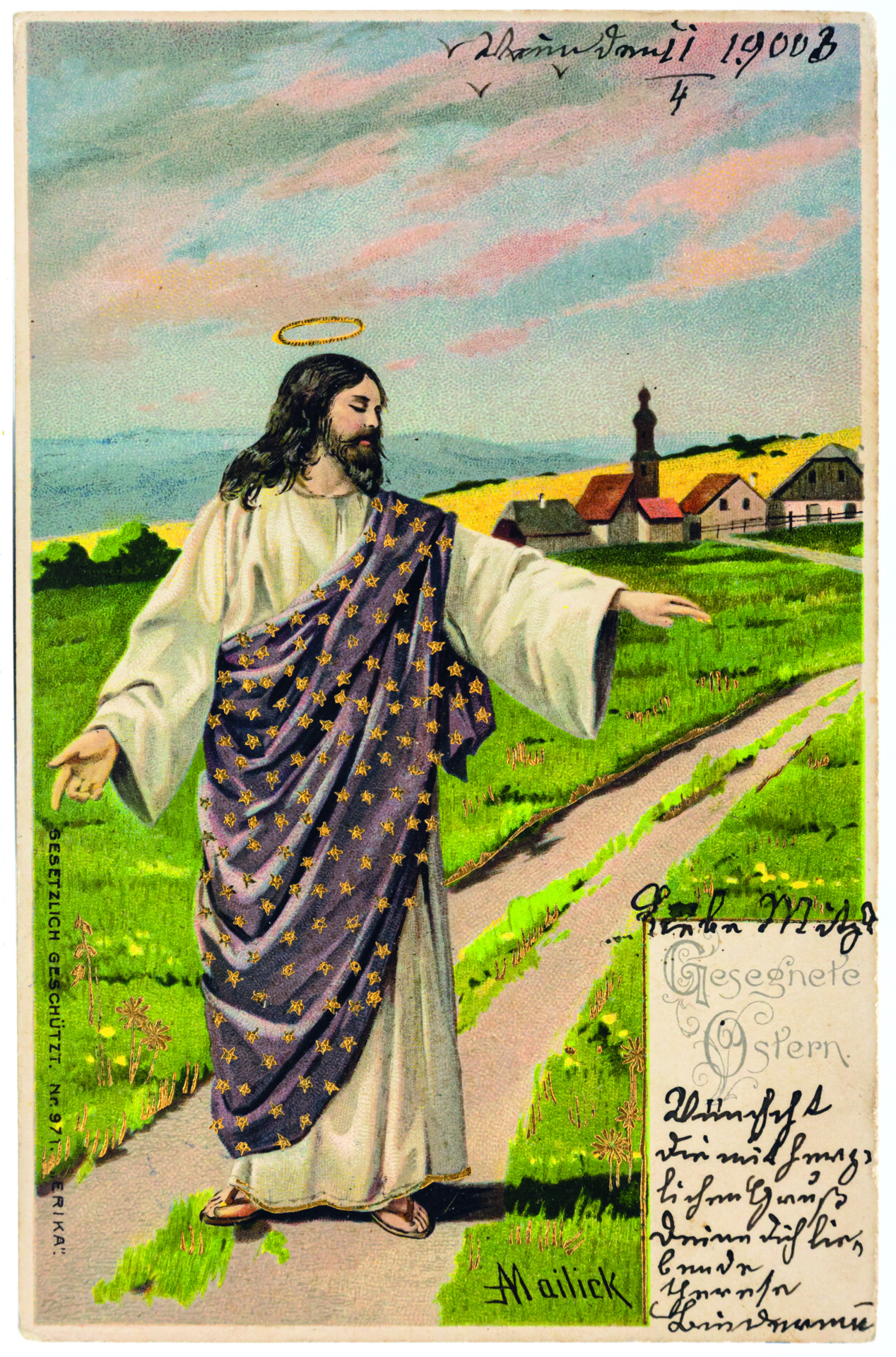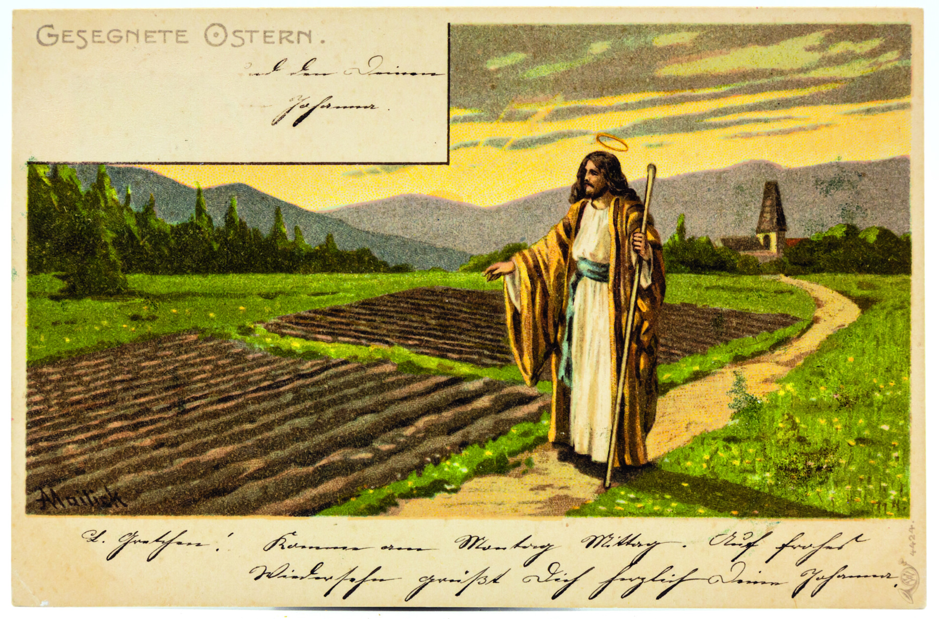 Den Felder segnenden Jesus hat allein Alfred Mailick in vier Variationen gemalt. Sie gemahnen an die Statue „Segnender Christus“ des dänischen Bildhauers Bertel Thorvaldsen (1770-1844) in der Frauenkirche in Kopenhagen. Auf den Karten 11 und 12 wandelt Jesus, zentral ins Bild gesetzt, einmal durch Wiesengründe und einmal an Ackerstücken entlang. In den untersuchten Online-Verkaufsforen tauchen diese beiden Darstellungen am häufigsten auf, nämlich insgesamt acht bzw. neun Mal. In einer weiteren Variante geht Jesus segnend einen steinigen Weg entlang, der von einem Zaunstück begrenzt ist.