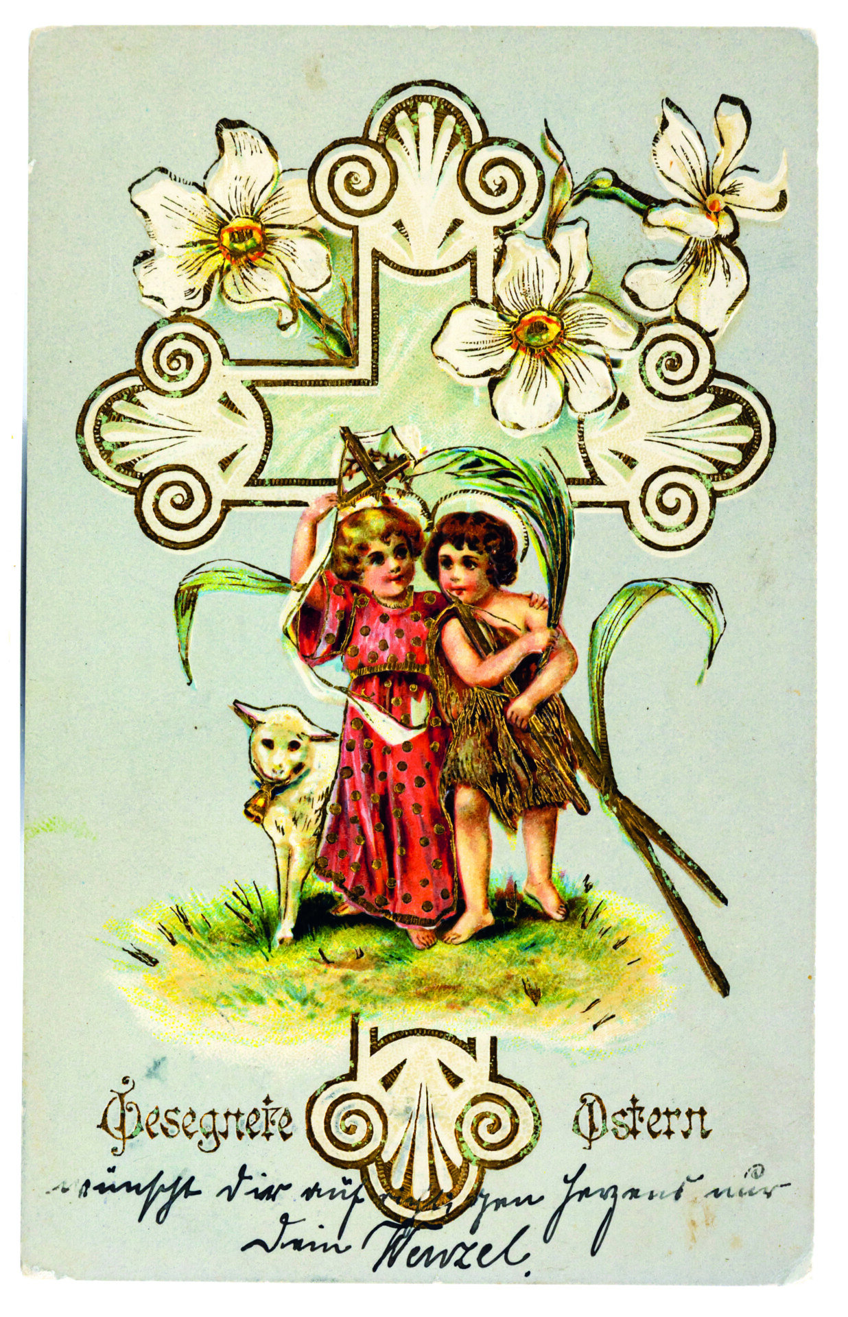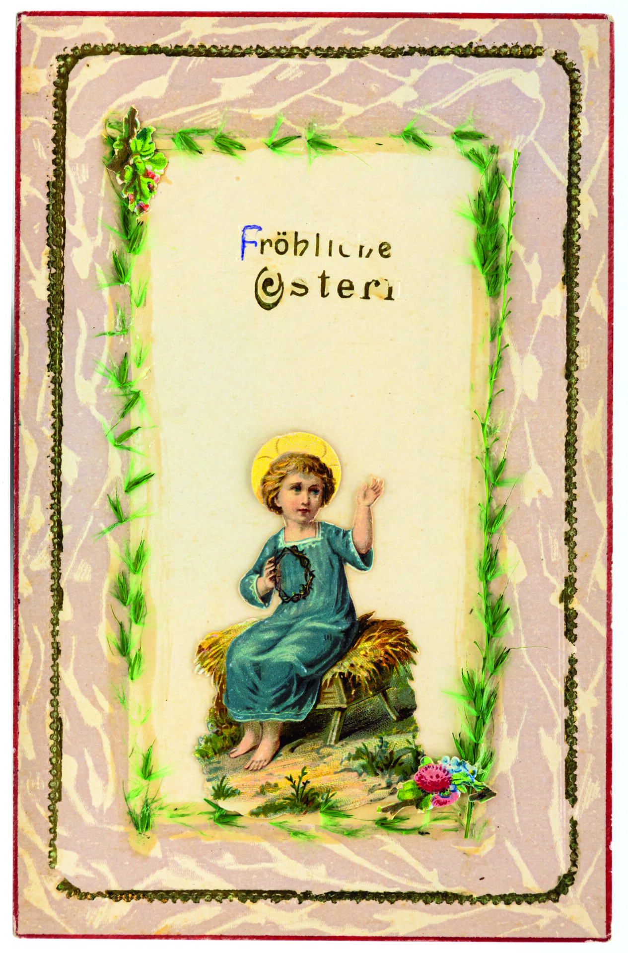 es aus einem Dornengestrüpp befreiend. Ein Einzelbeleg stellt Jesus in Rückenansicht mit Heiligenschein dar, wie er eine Schafherde auf eine beleuchtete Kirche zuführt. Derlei „geistliche Allegorie[en]“ waren, besonders in pietistischen Kreisen, seit dem 17. Jahrhundert bekannt. Man geht davon aus, „daß der Anblick eines Schäfers mit seiner Herde geistlich zu interpretieren sei.“ Karte 4 präsentiert ein gut gelauntes Jesuskind, Arm in Arm mit der ebenfalls kindlichen Gestalt von Johannes dem Täufer, erkennbar an einem Tierfell und der Siegespalme, vor einem liliengeschmückten Kreuz. Wie auf Karte 1 dient das weiße Lamm mit hellblauem Halsband und Glöckchen als Hinweis auf Ostern. Einzeldarstellungen des Jesusknaben oder gemeinsam mit Johannes dem Täufer sind ebenfalls „traditionelle theologische Allegorien“.